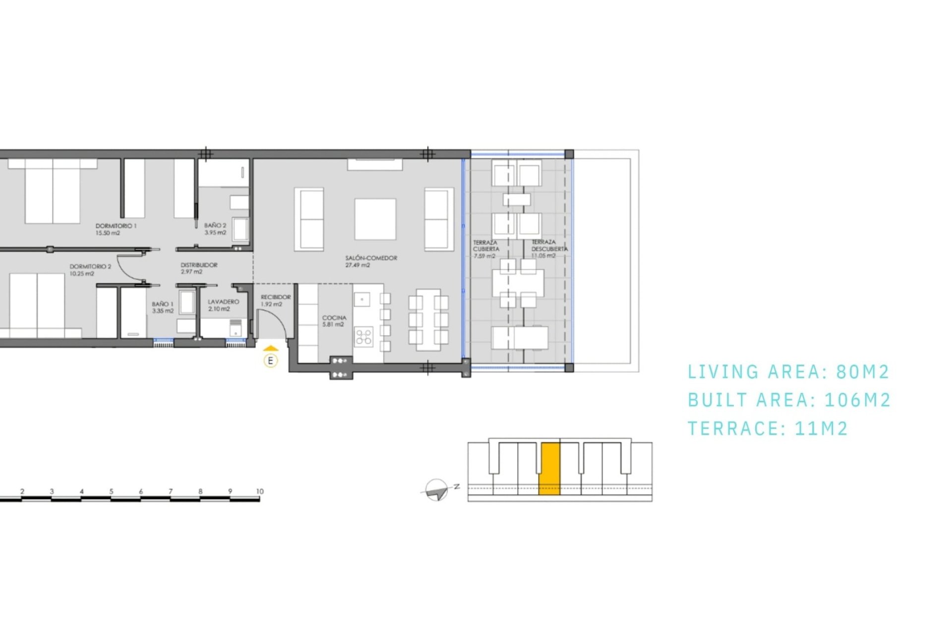 Apartamentos de estilo moderno, diseñados con espacios abiertos y grandes ventanales, cocina abierta al salón, dormitorio principal con vestidor. Dos baños. Las plantas bajas cuentan con amplias terrazas orientadas a la piscina mientras que el ático cuenta con un solárium de más de 70m2. Todas las viviendas cuentan con plaza de aparcamiento subterráneo para su vehículo y trastero.