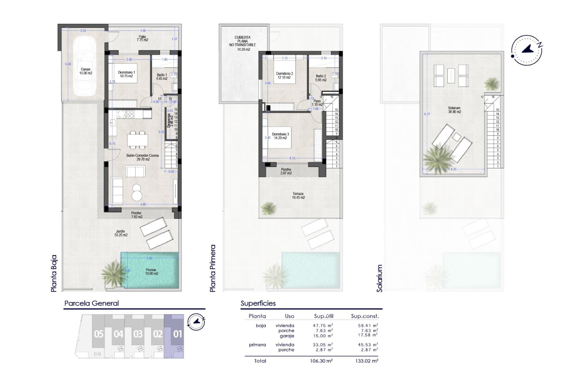 Las viviendas cuentan con 3 dormitorios y 2 baños, distribuidos en una superficie construida de aproximadamente 133 m² sobre parcelas privadas de entre 154 y 190 m². En el exterior, podrás relajarte en tu propia piscina privada, disfrutar de agradables veladas en la terraza o en el solárium de más de 38 m², perfecto para instalar una zona chill-out o un comedor al aire libre.